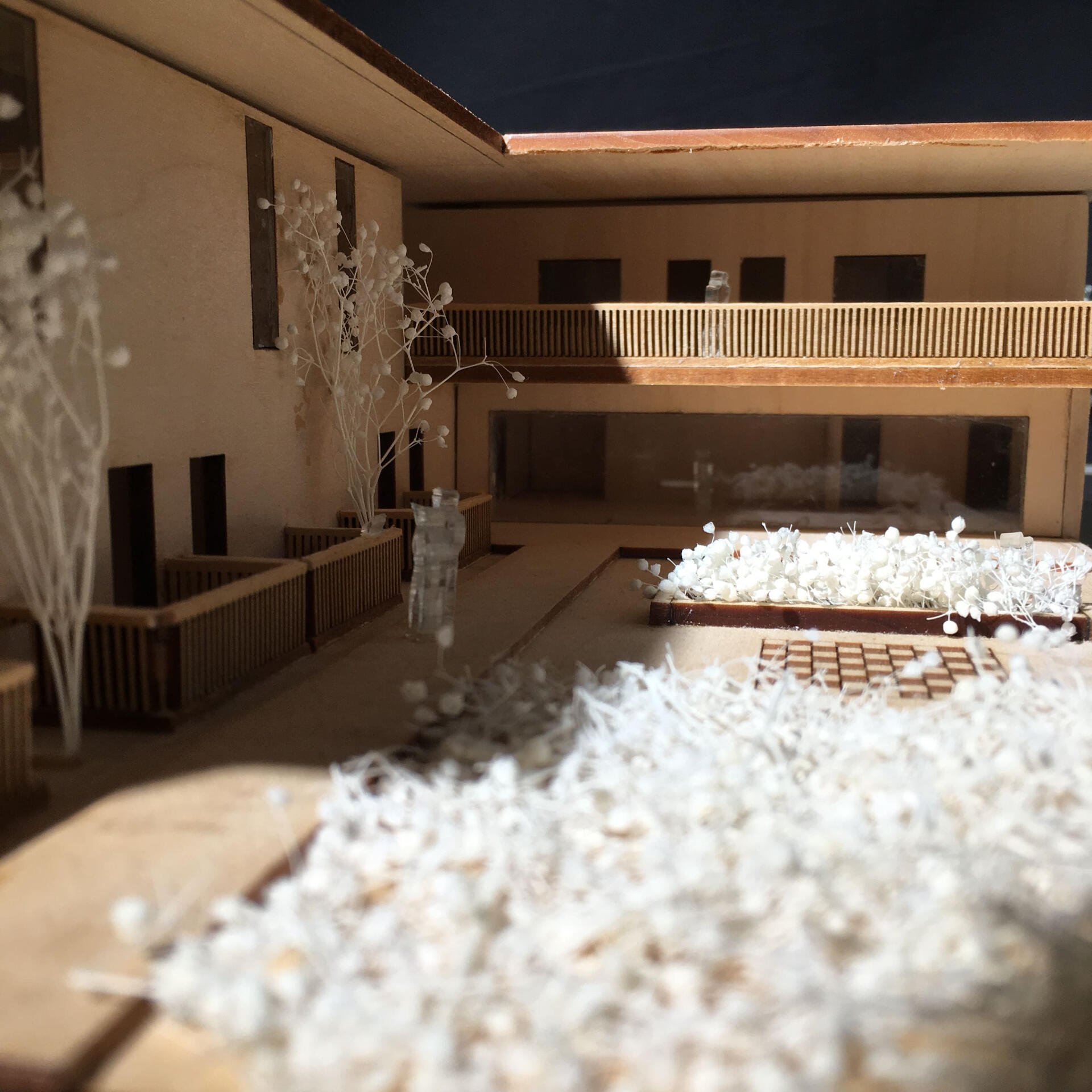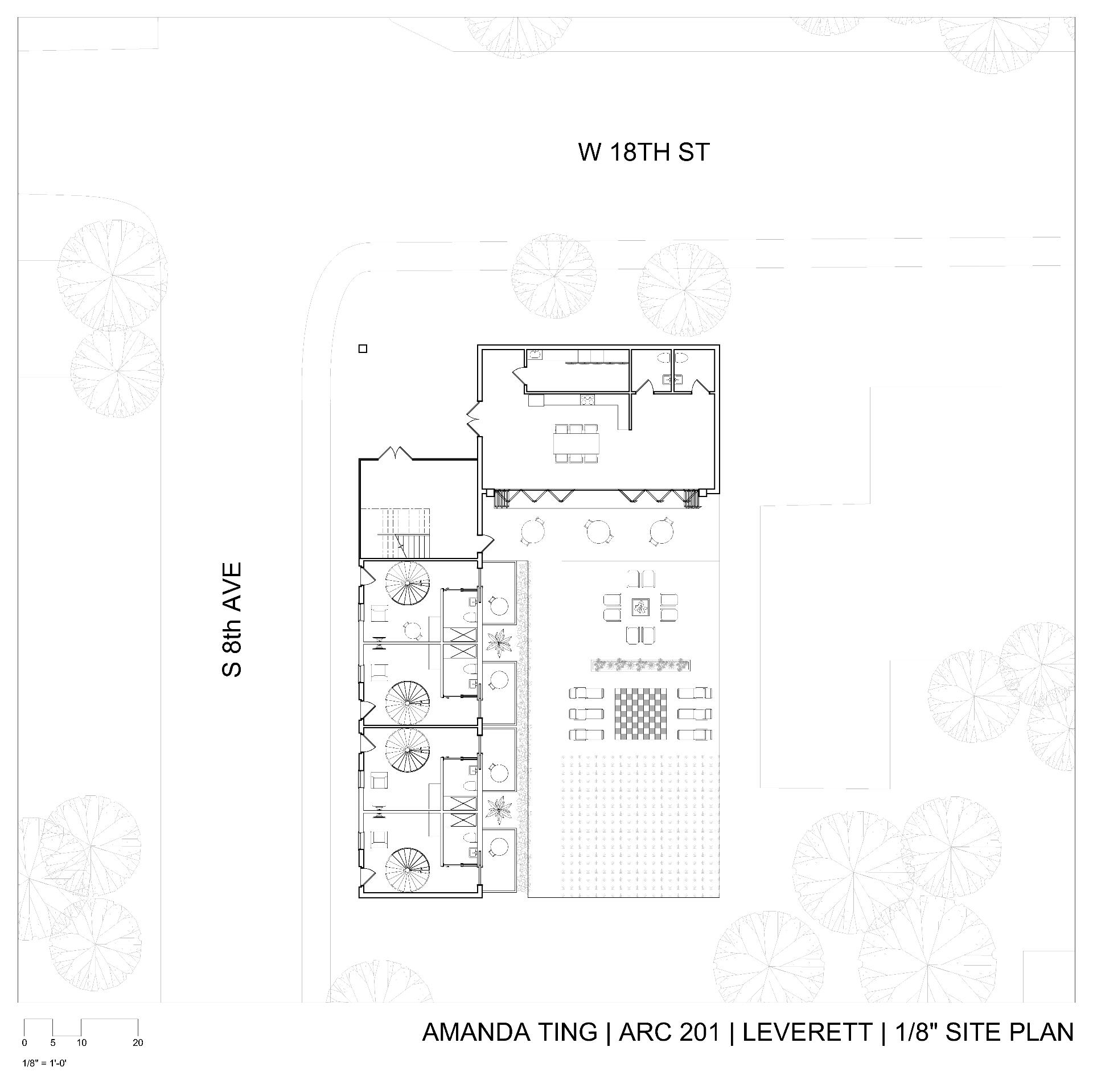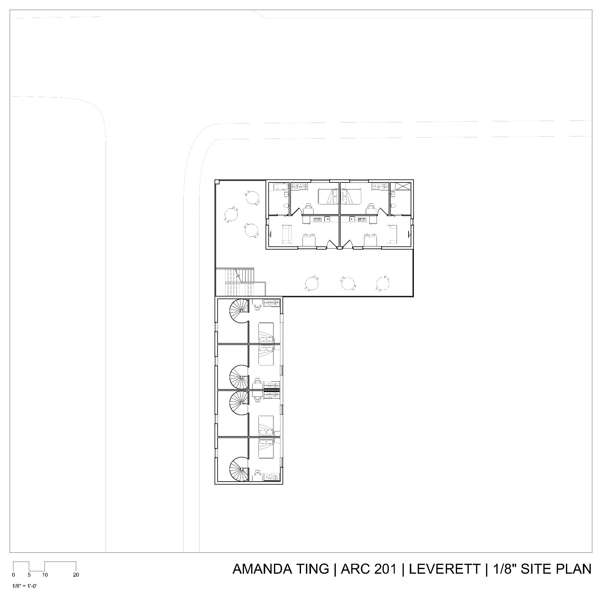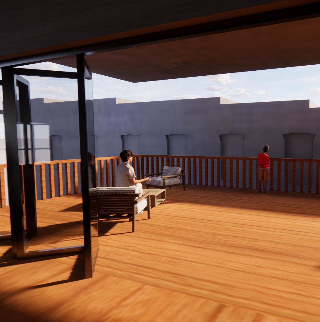 This project was mainly concerned with the design of an affordable housing complex in Tucson's Old Barrio district. The building takes the shape of an inverted L - the long side consists of double height studio apartments, and the short side is split between communal living space and one-bedroom apartments. The remainder of the site is allocated towards an outdoor courtyard, with the shared spaces being able to open up towards it.