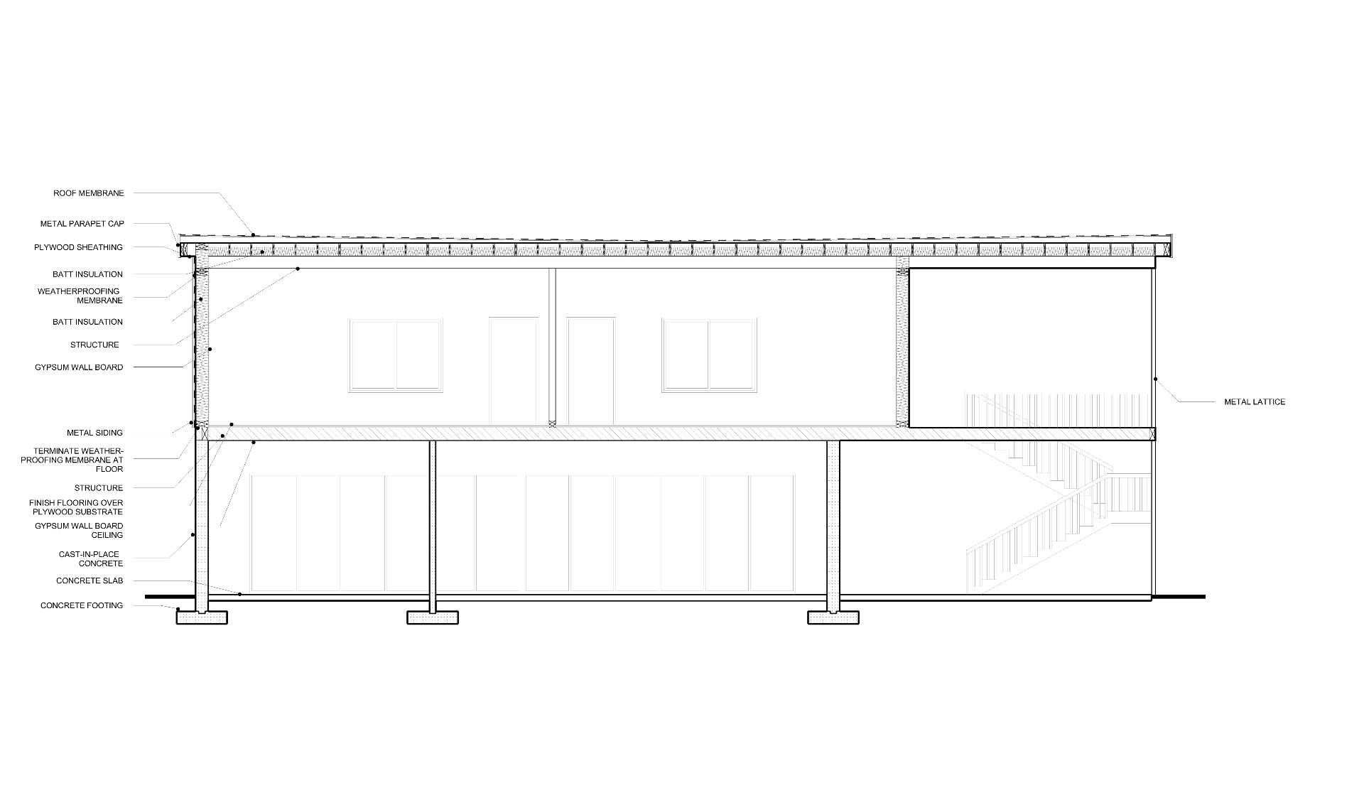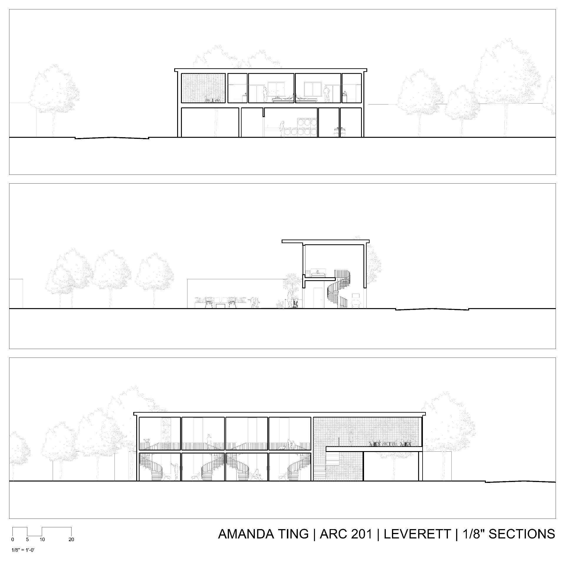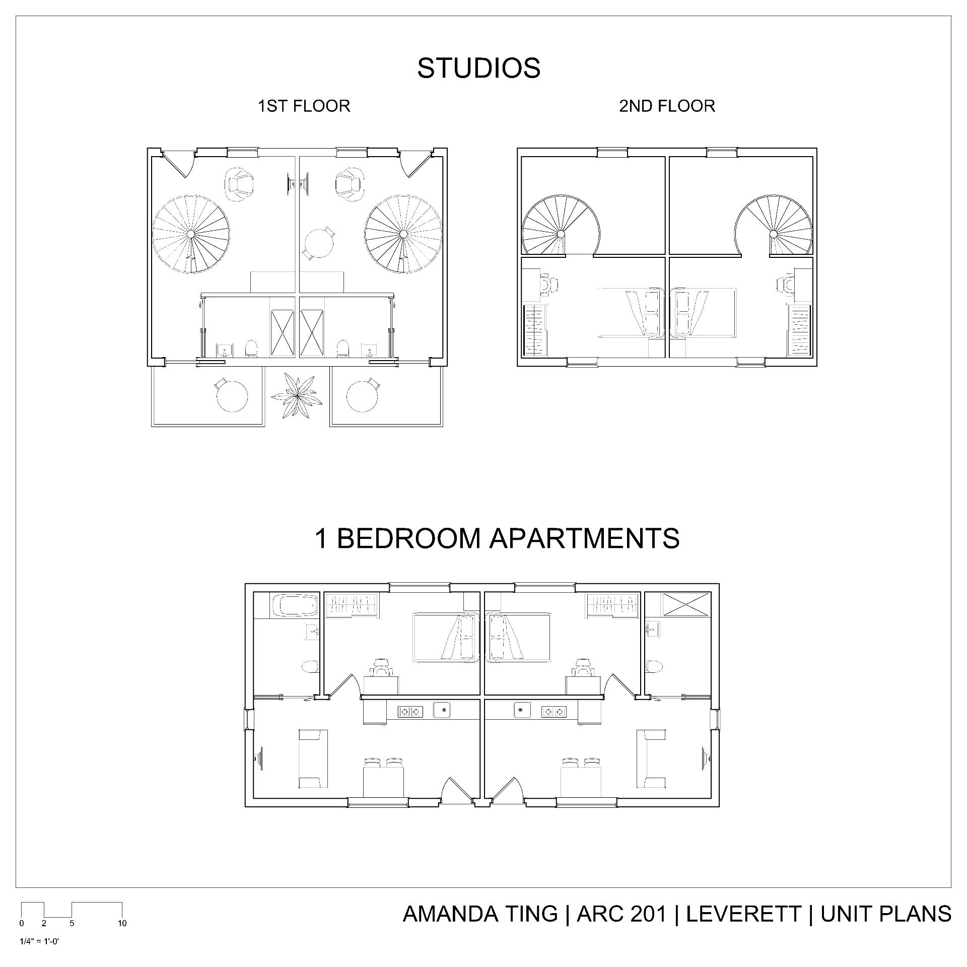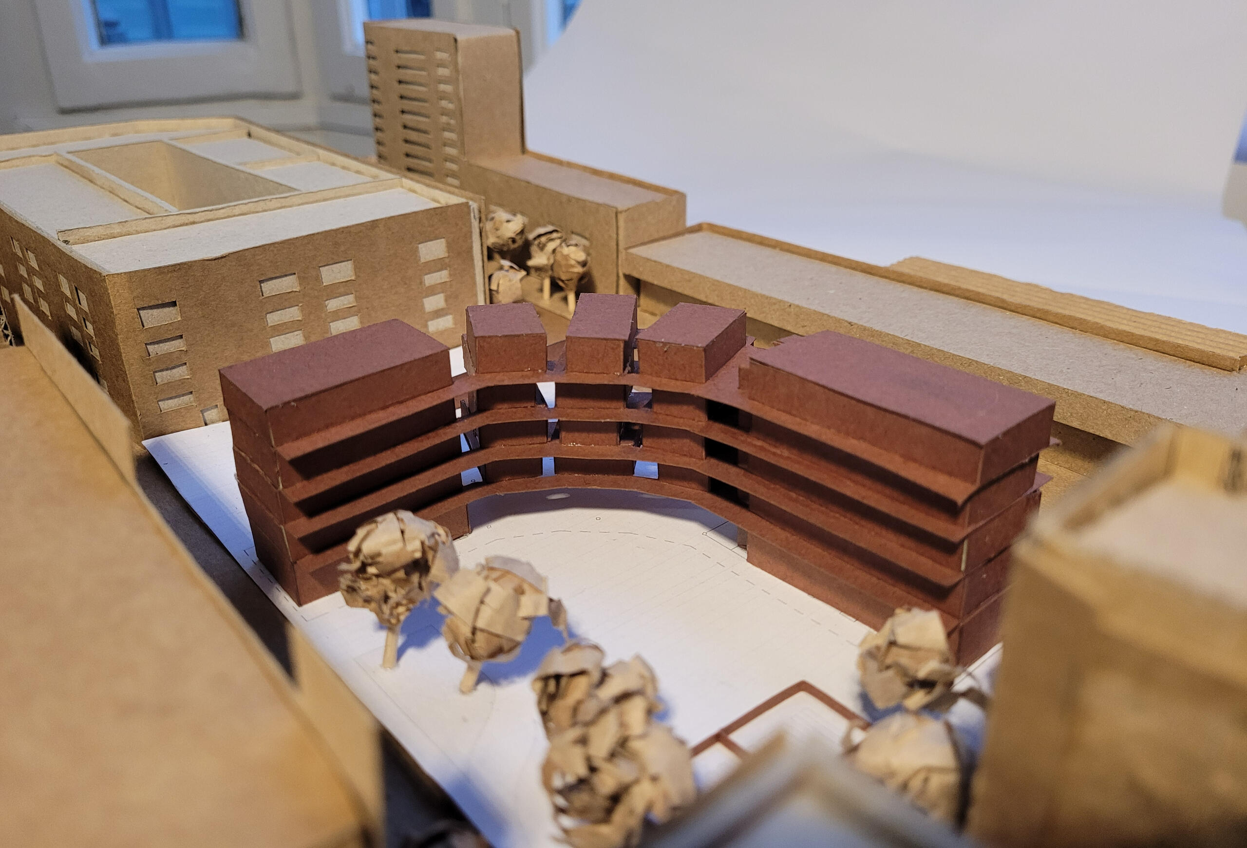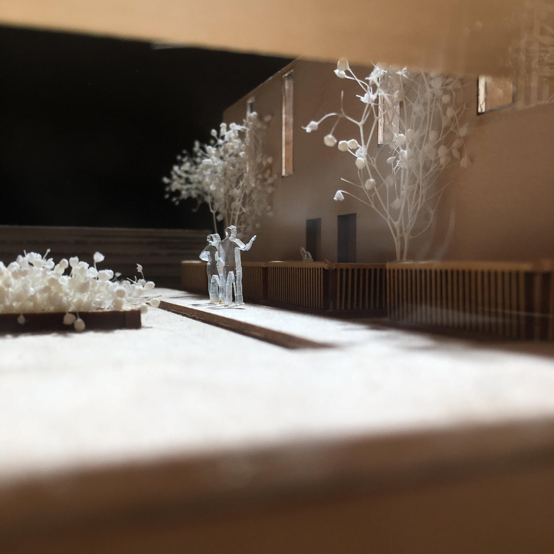 This project was mainly concerned with the design of an affordable housing complex in Tucson's Old Barrio district. The building takes the shape of an inverted L - the long side consists of double height studio apartments, and the short side is split between communal living space and one-bedroom apartments. The remainder of the site is allocated towards an outdoor courtyard, with the shared spaces being able to open up towards it.