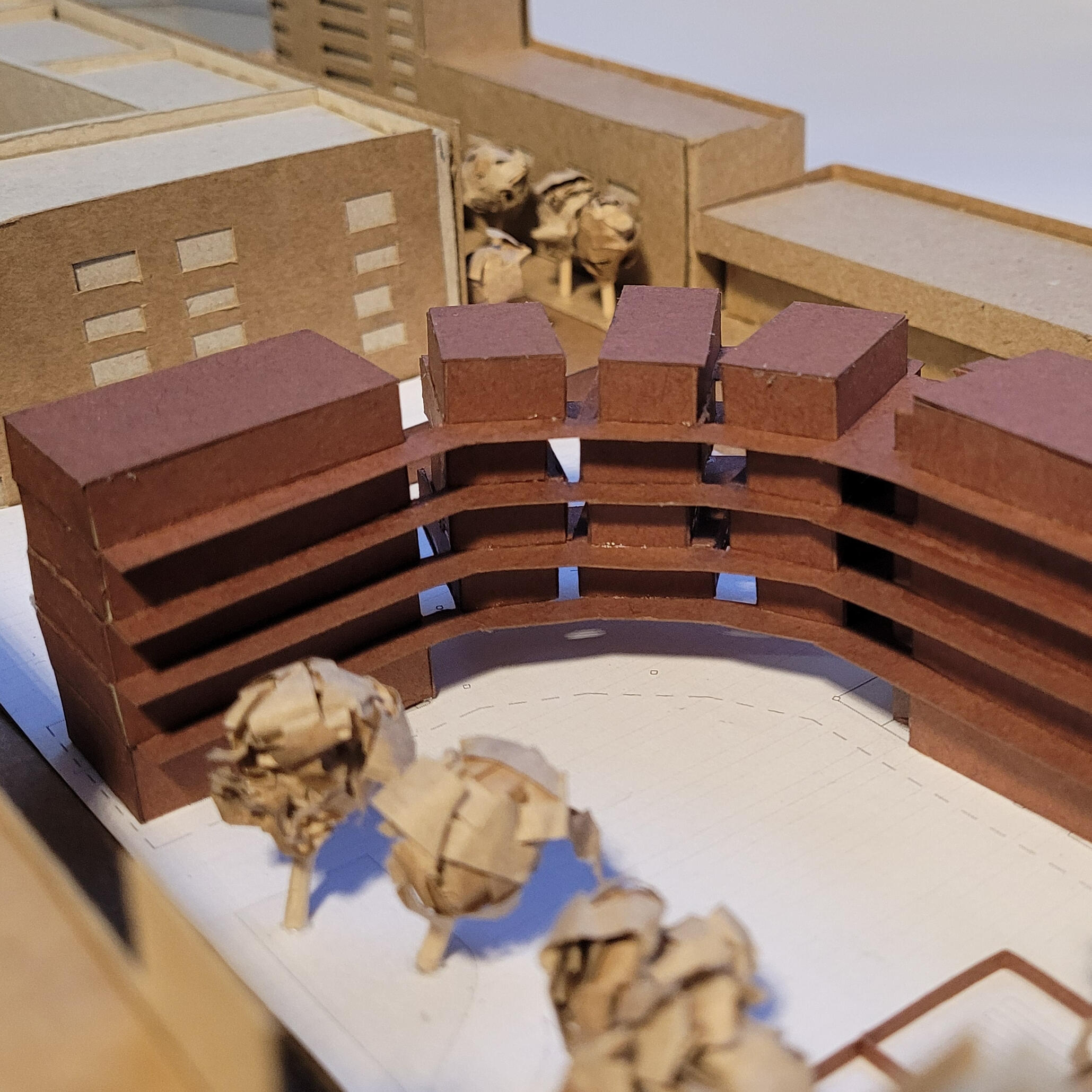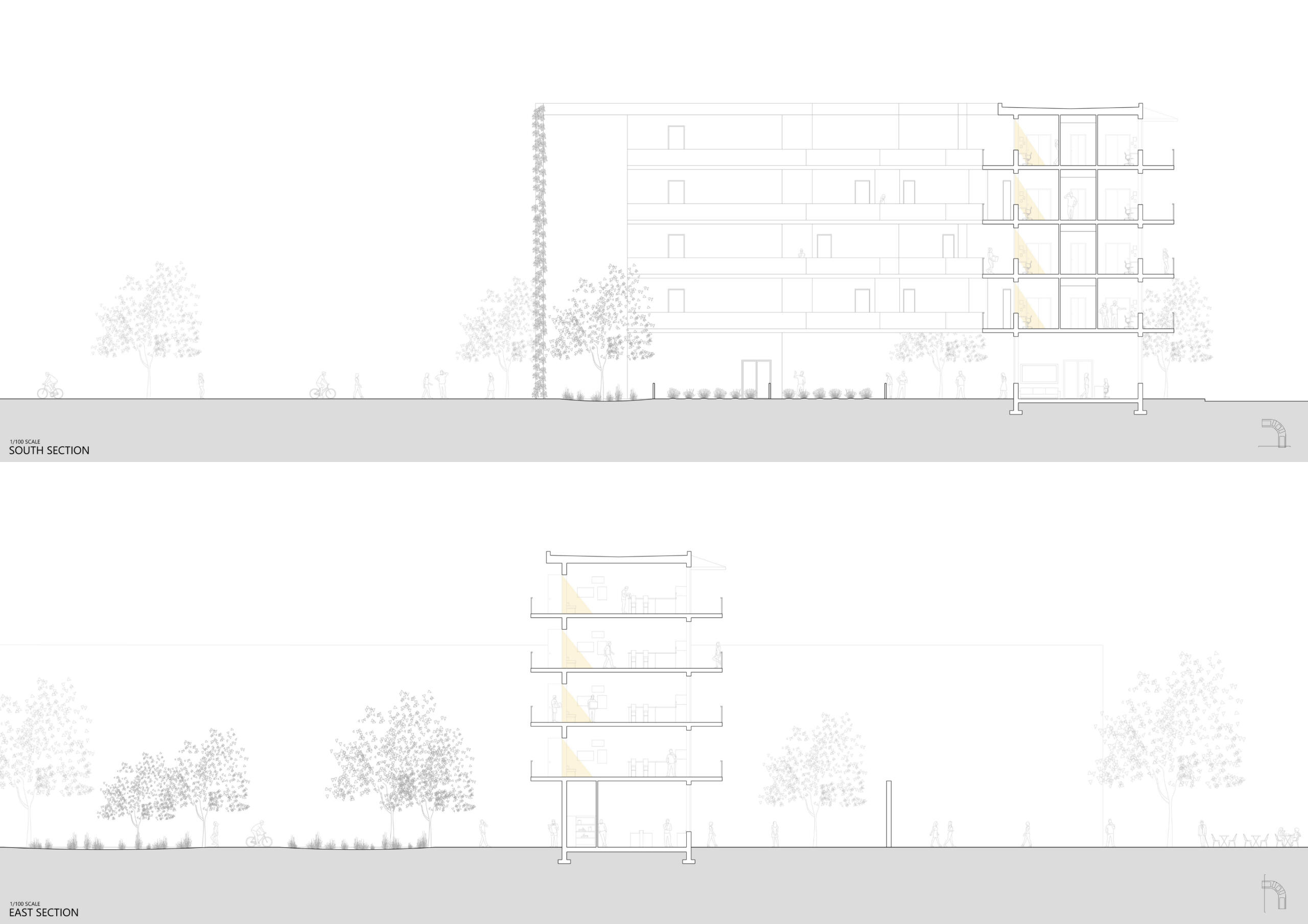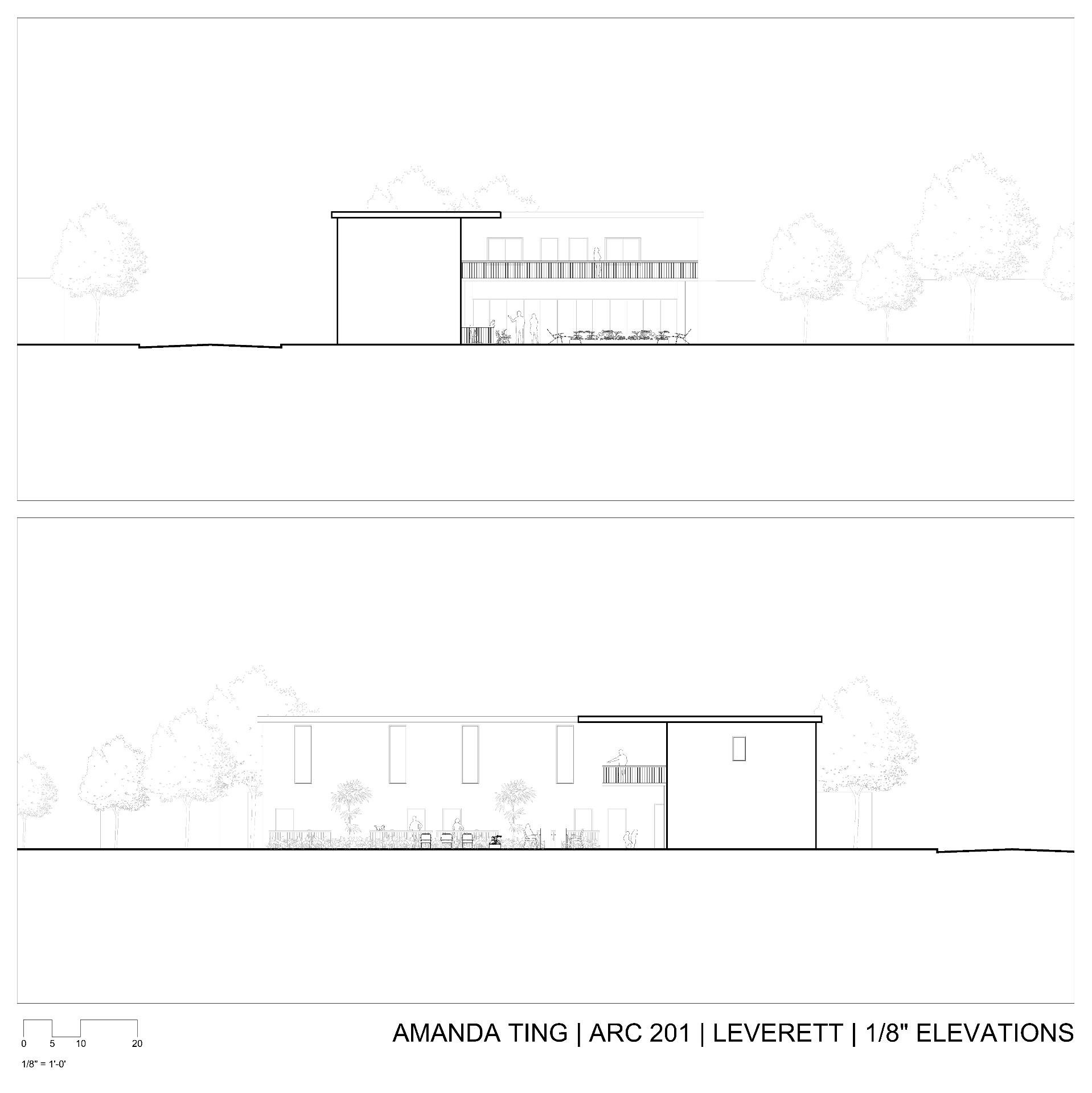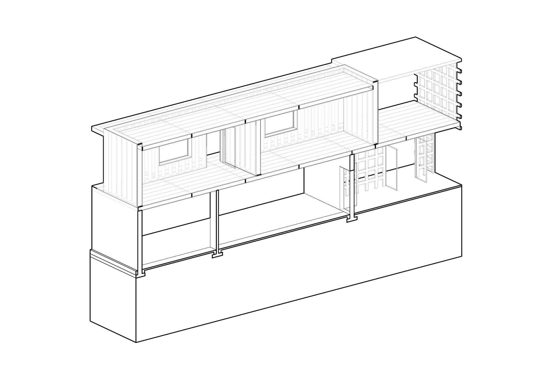This project was mainly concerned with the design of an affordable housing complex in Tucson's Old Barrio district. The building takes the shape of an inverted L - the long side consists of double height studio apartments, and the short side is split between communal living space and one-bedroom apartments. The remainder of the site is allocated towards an outdoor courtyard, with the shared spaces being able to open up towards it.