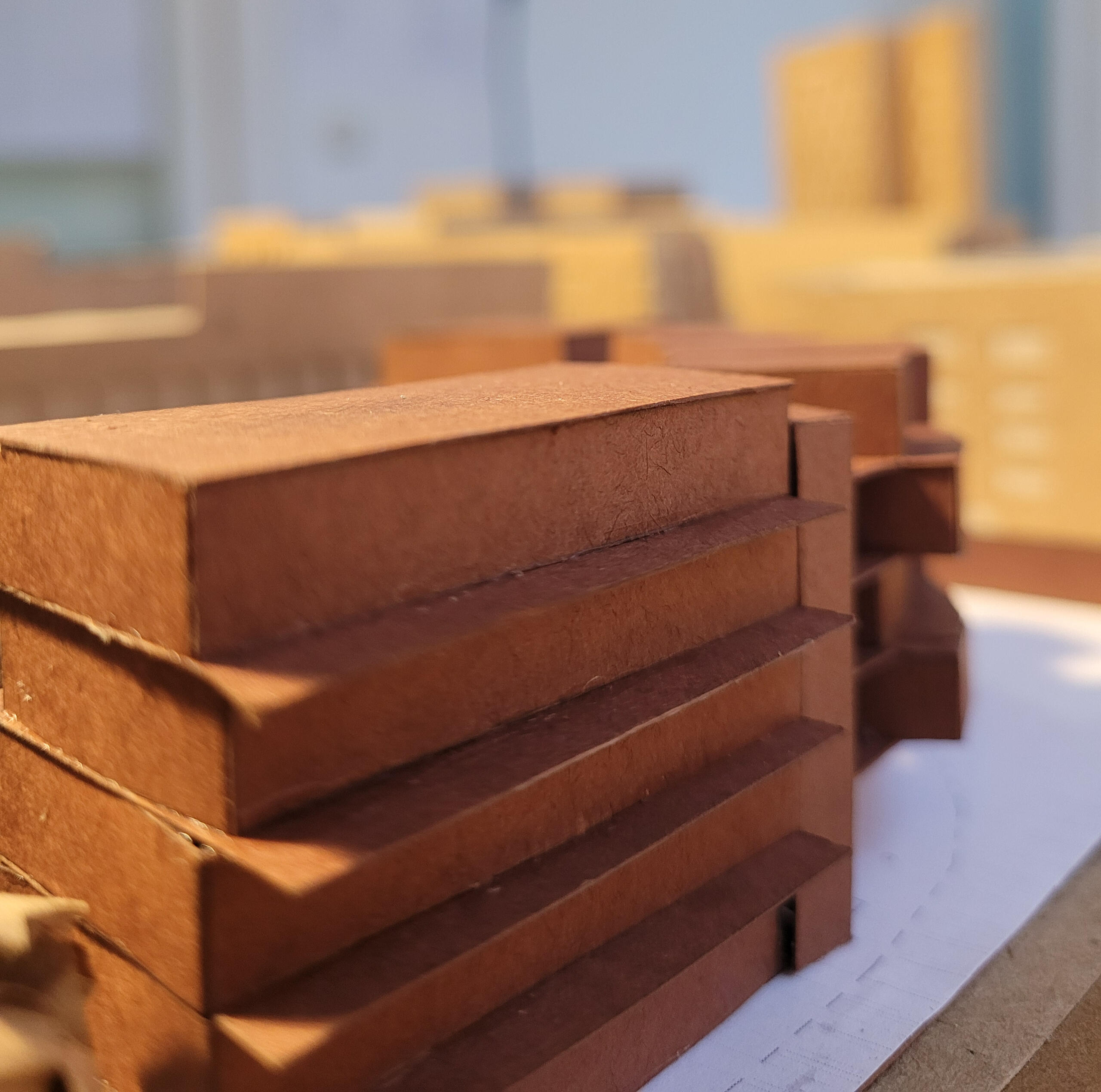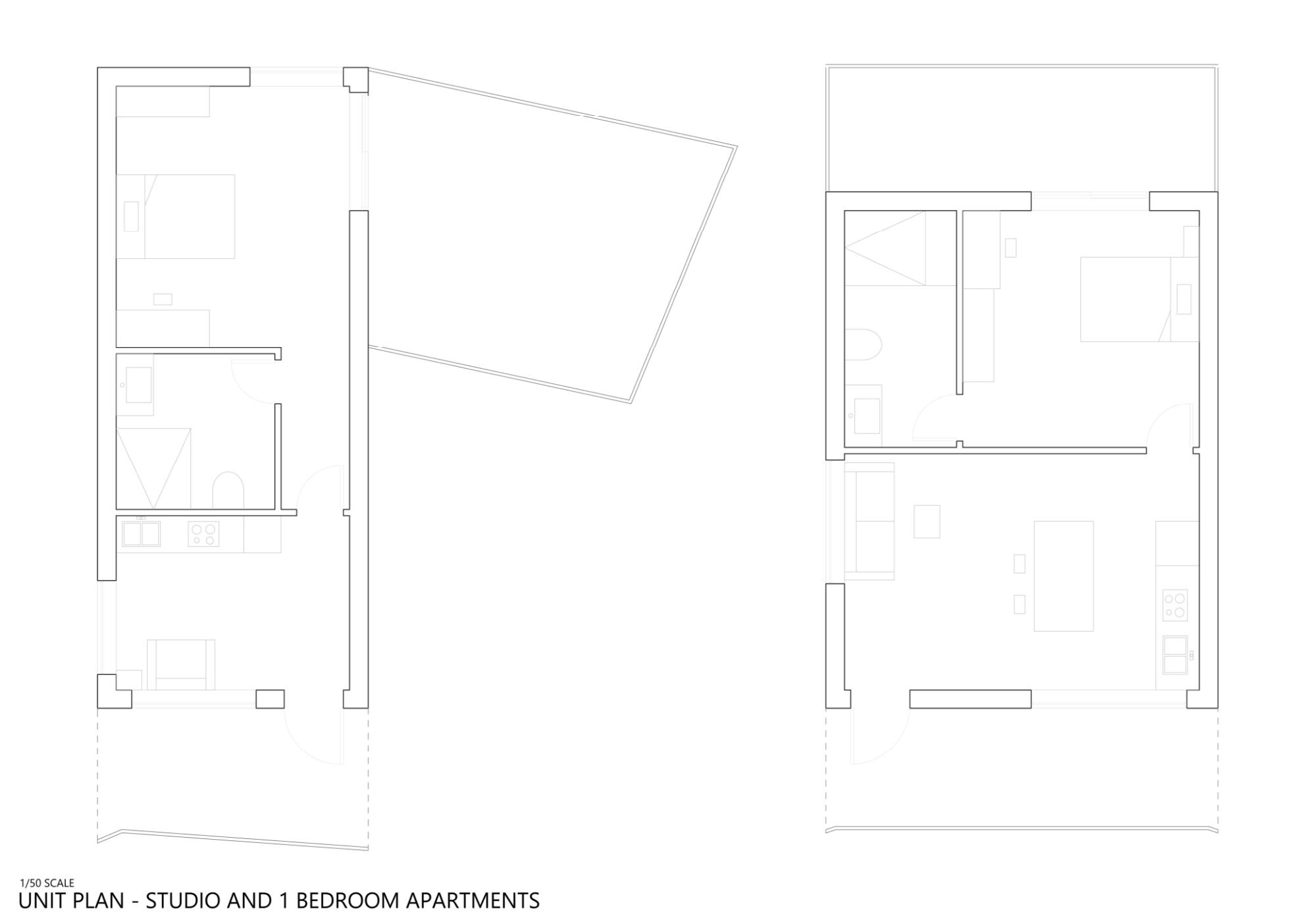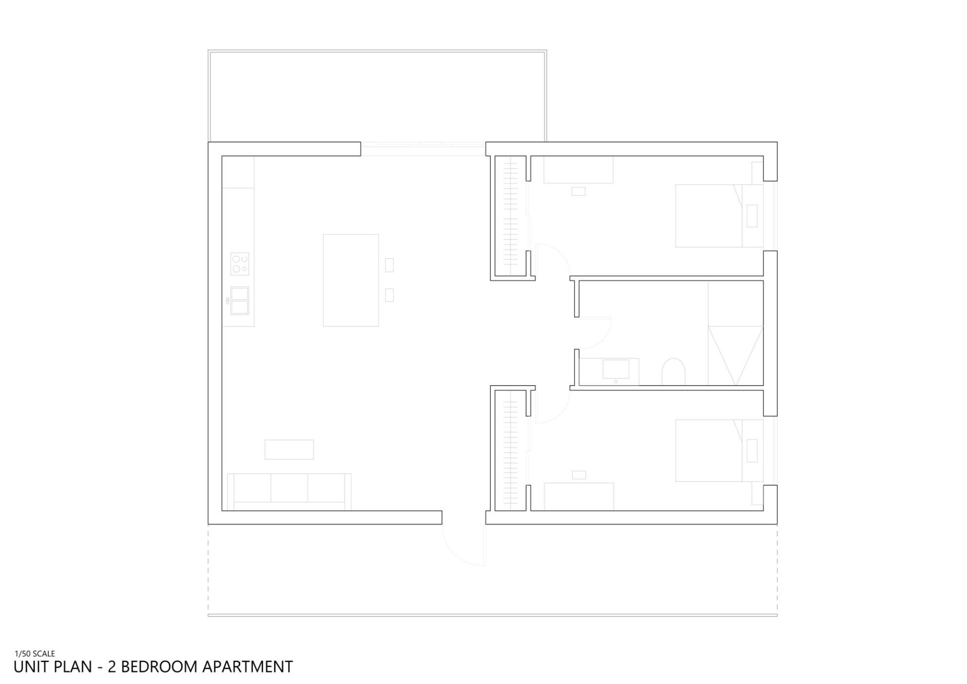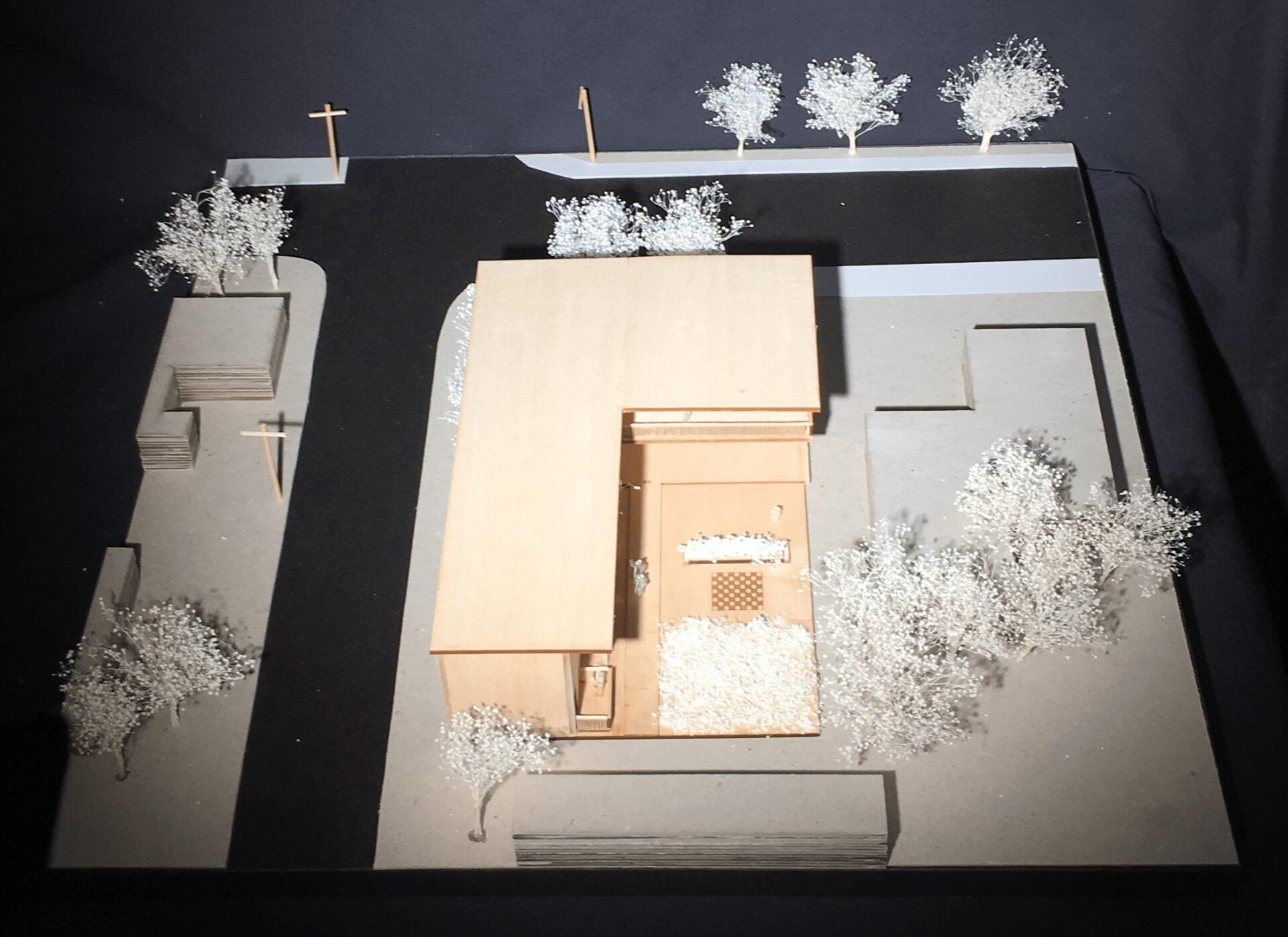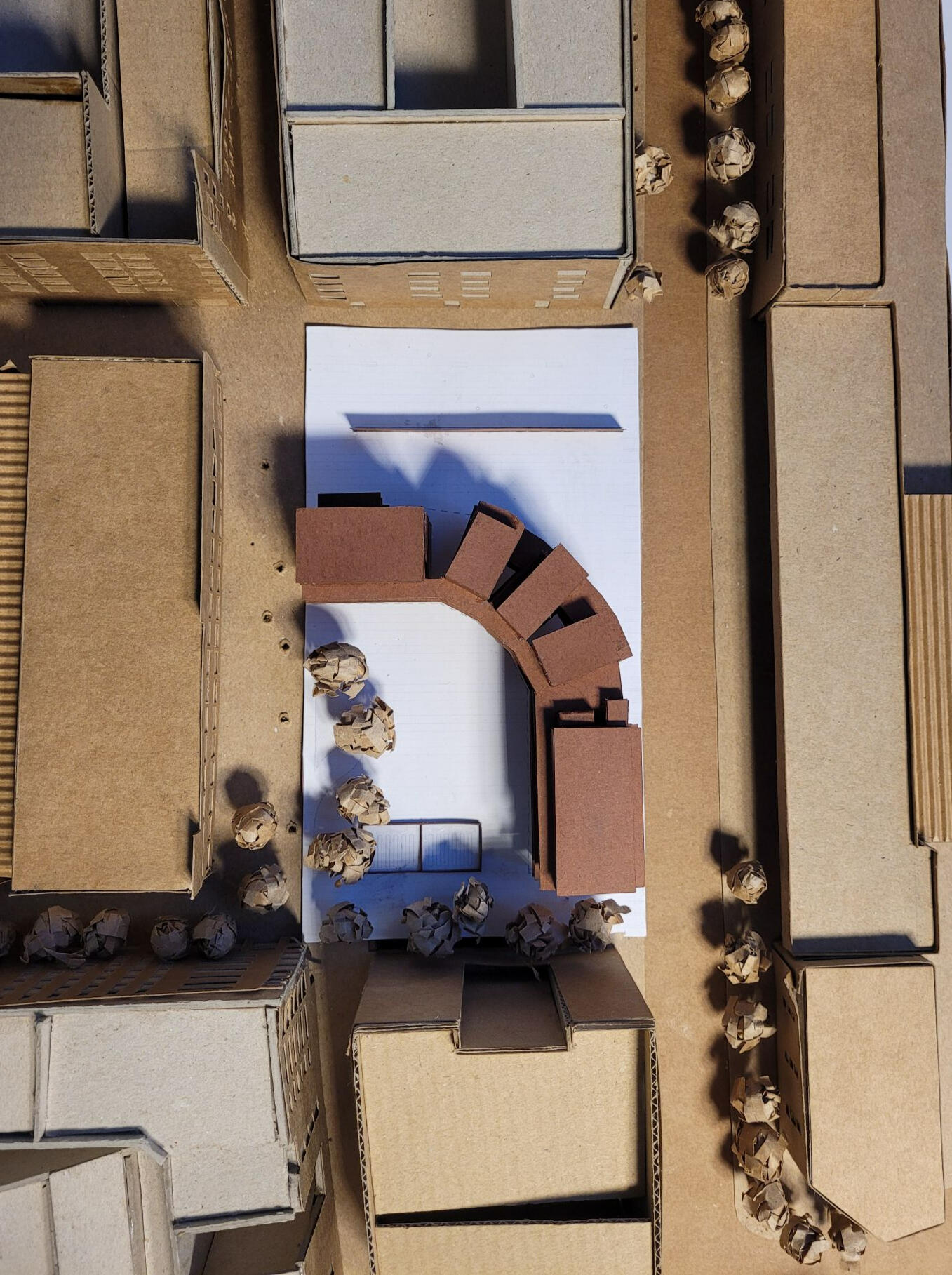 This project was mainly concerned with the design of an affordable housing complex in Tucson's Old Barrio district. The building takes the shape of an inverted L - the long side consists of double height studio apartments, and the short side is split between communal living space and one-bedroom apartments. The remainder of the site is allocated towards an outdoor courtyard, with the shared spaces being able to open up towards it.
