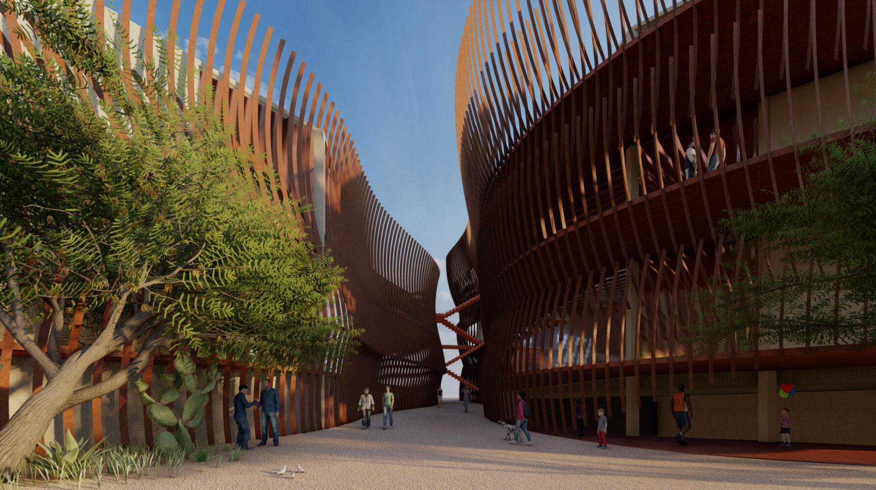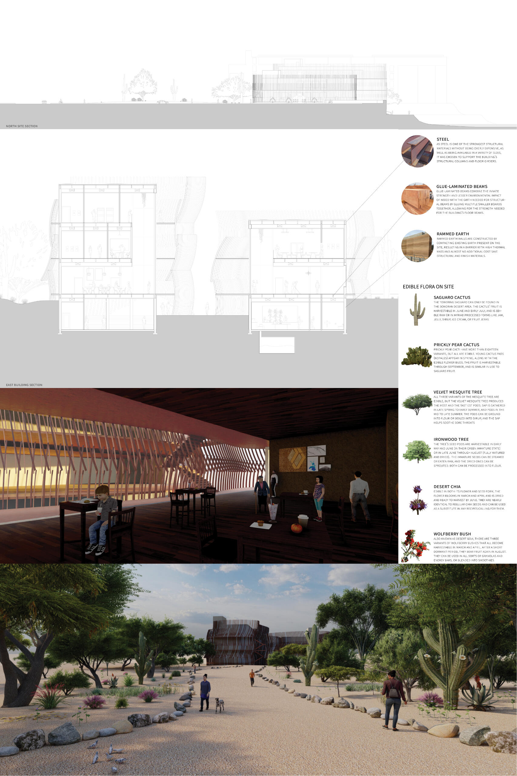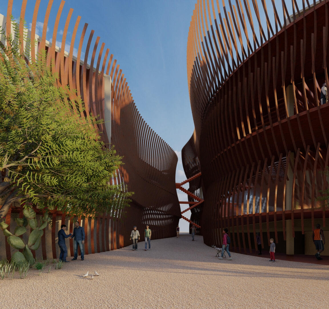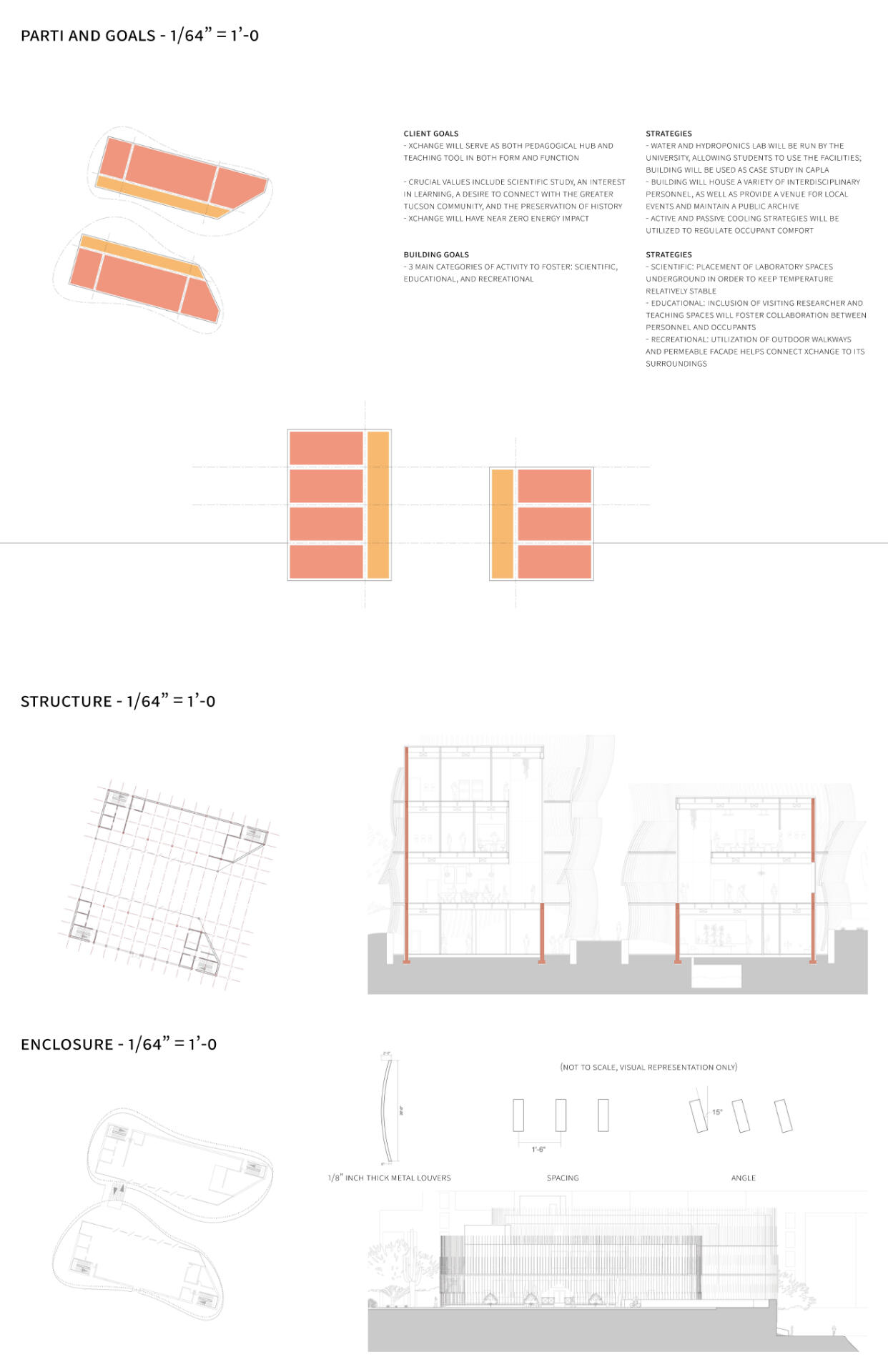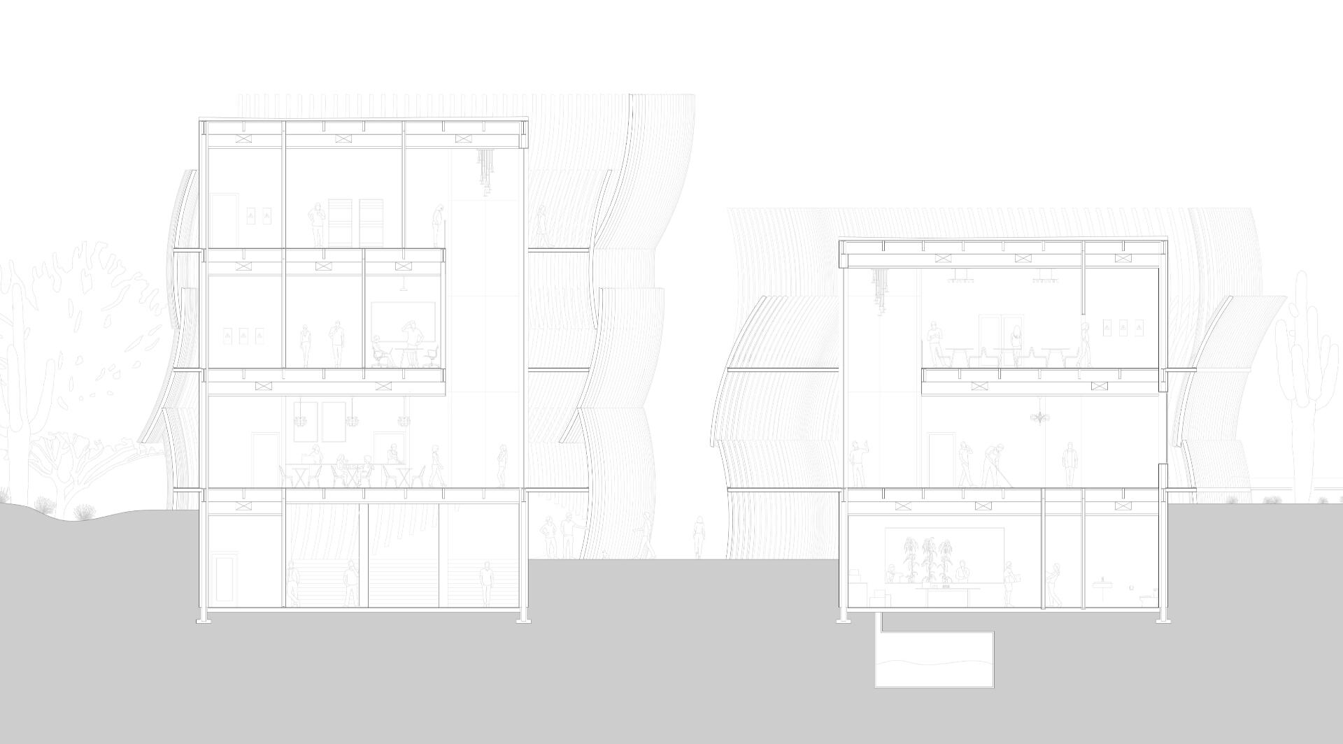The Sonoran Canyon resourceXchange serves as an example of a building designed to be an environmental teaching tool in both form and function. Public, teaching, and research spaces are integrated into a pair of buildings framed by a canyon-like facade and angled to better take advantage of environmental condition on the site.By designing the basic form of the building to benefit from and work with the quirks of its surrounding environment, the Xchange draws one step closer to being fully entrenched in both the urban and environmental fabric of Tucson.This project was a finalist in the Building Envelope category of the 2021 Richard Kennedy Architects prize.