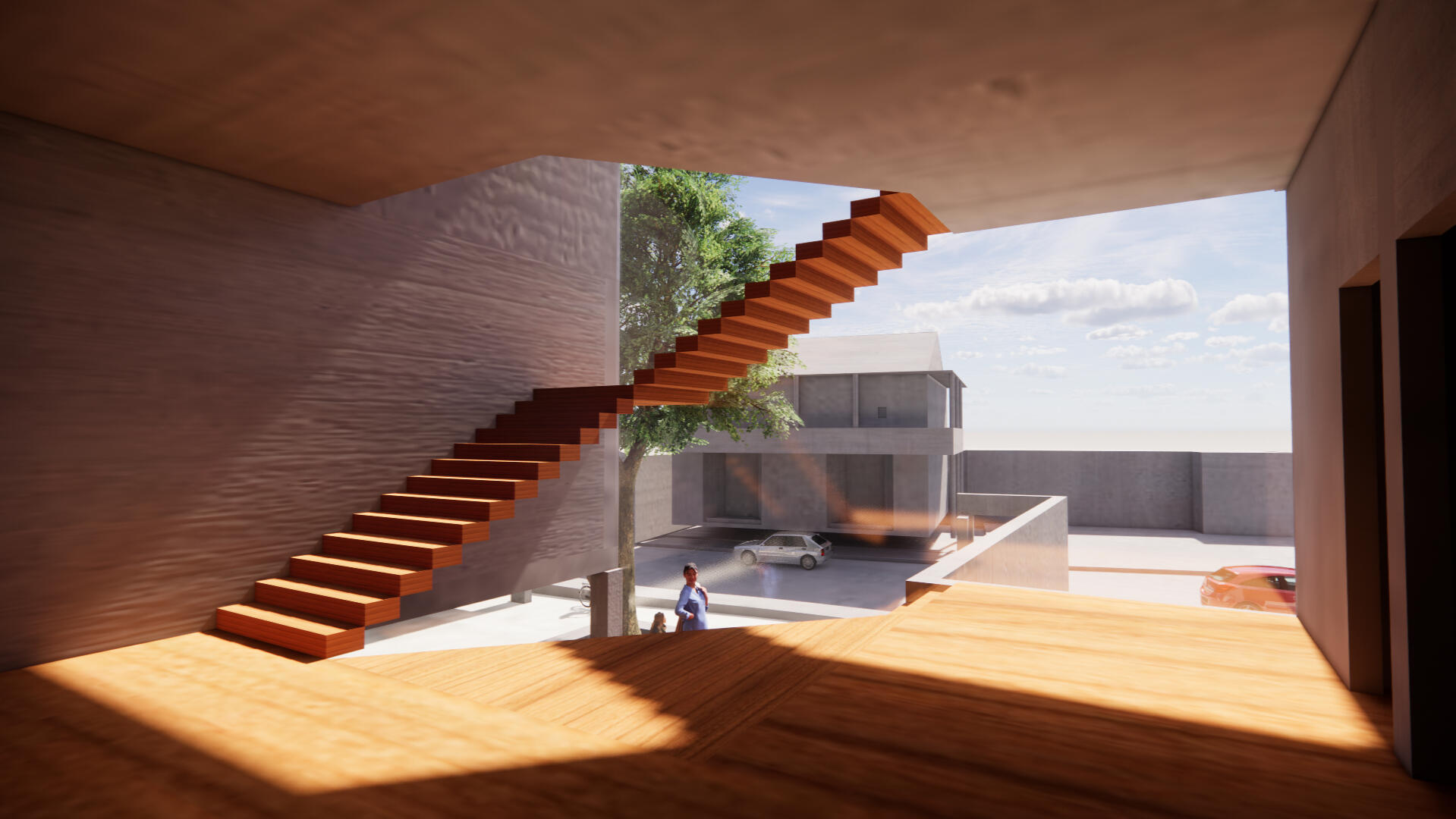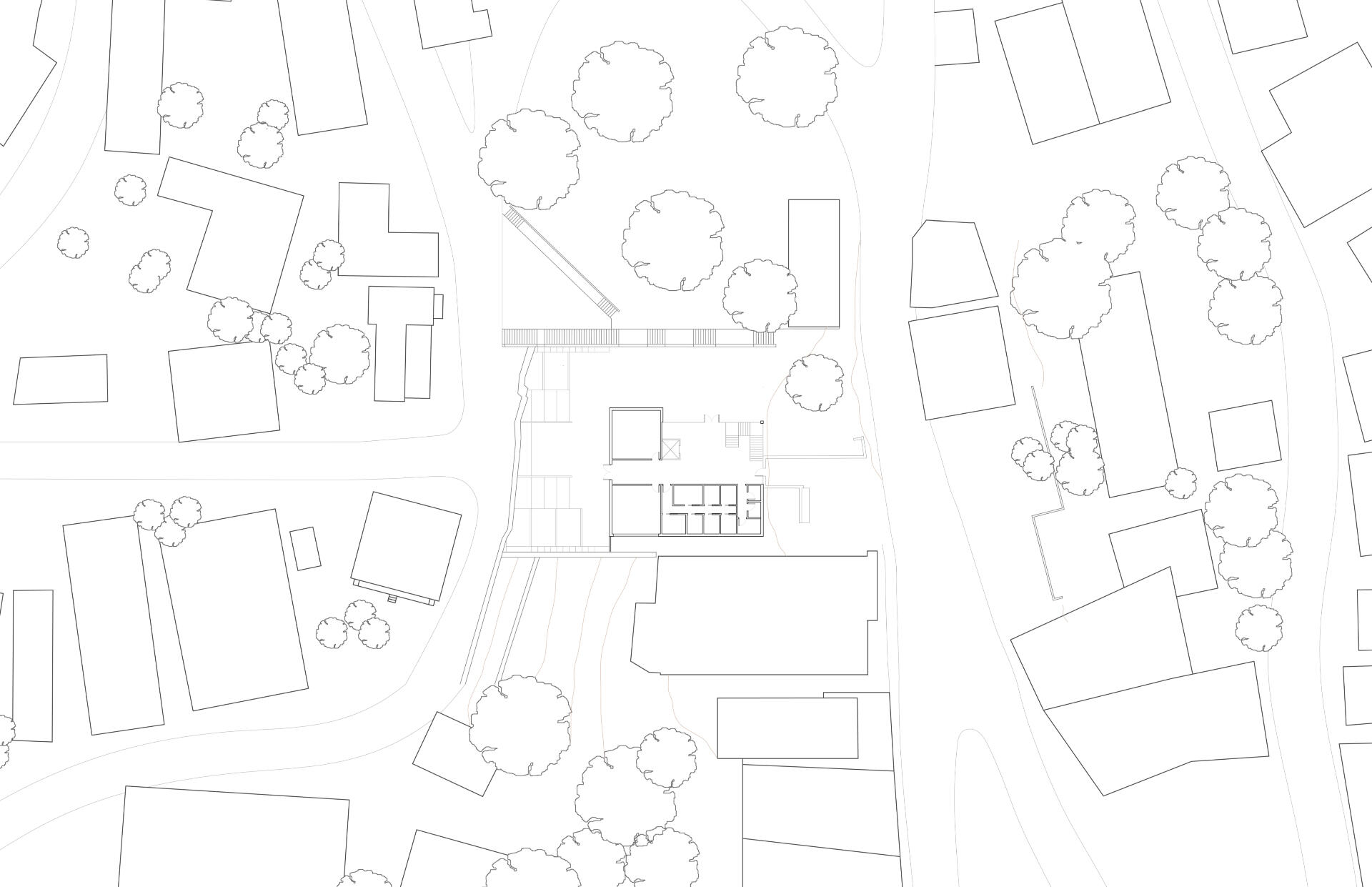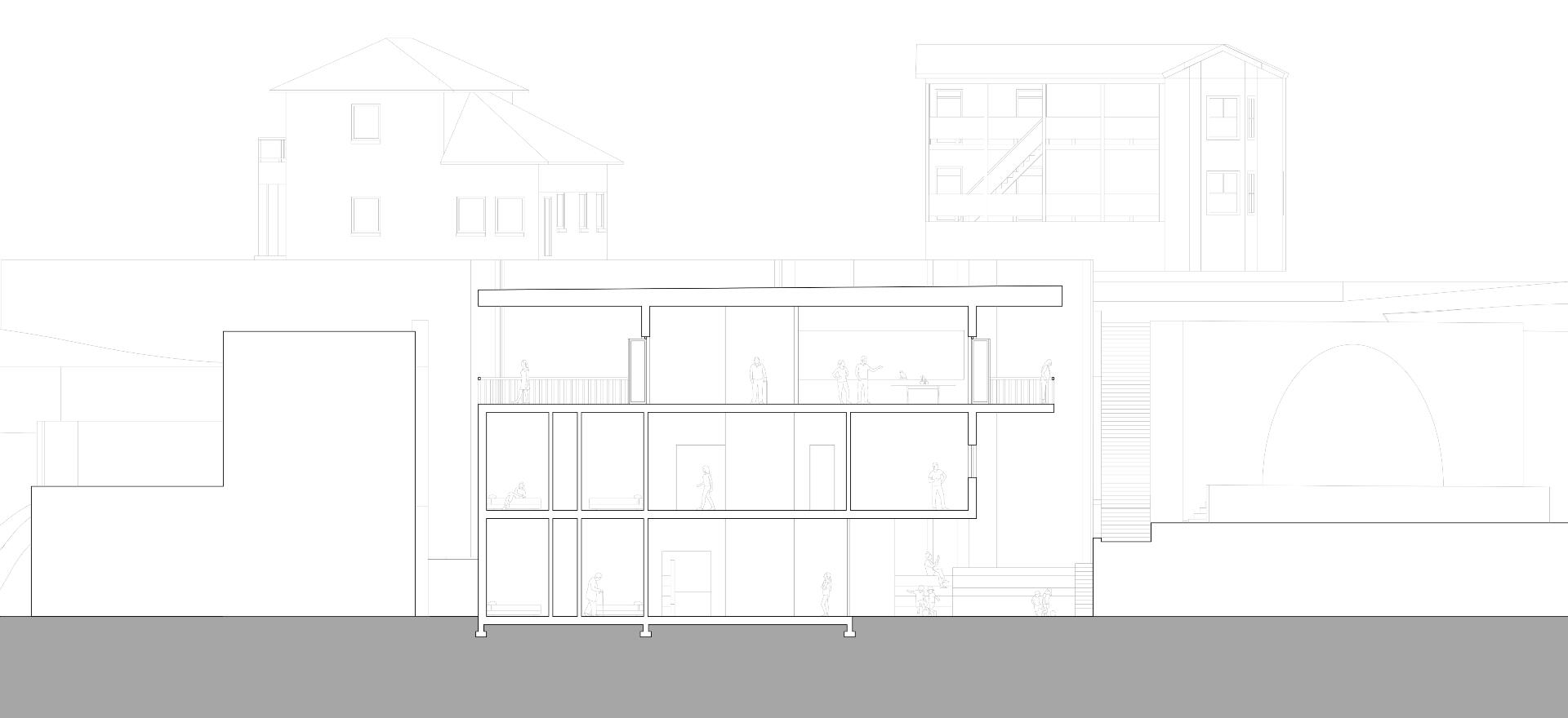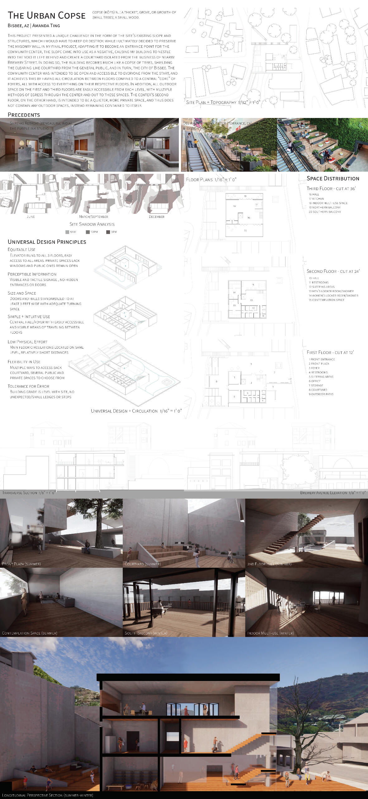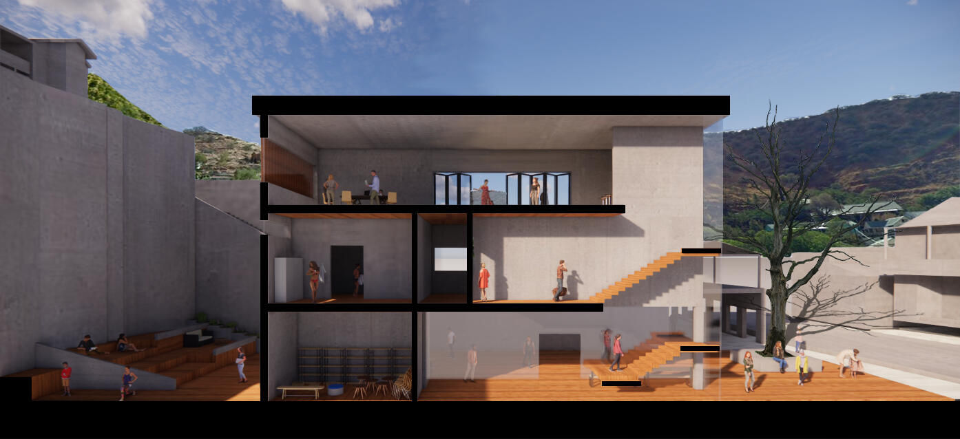 The site for this community center project is a rather steeply sloped empty lot in the heart of Bisbee, Arizona, a small town known for its large artist and artisan population.Most of the earth on the site has been removed, creating a void that the building nestles itself into. This results in the creation of a shaded courtyard, where the sheer height of the left side of the site casts a large shadow over the multiple floors of the community center even during the summer.All spaces on all floors are easily accessible from a central circulation core, which contains an elevator bank and a grand staircase.