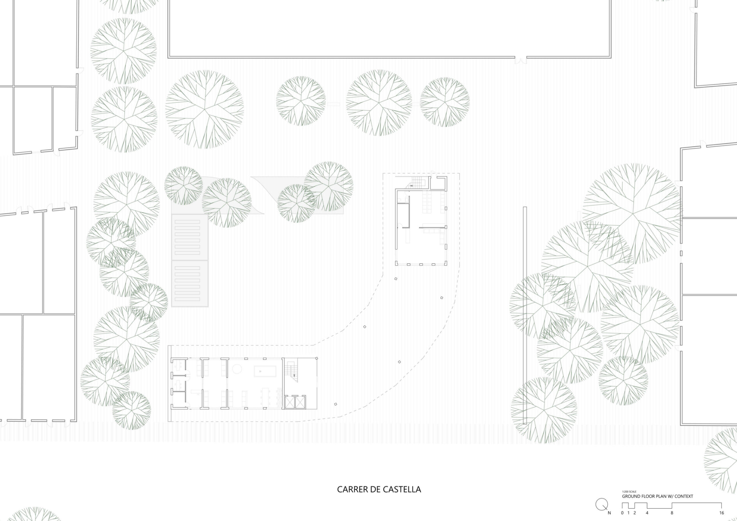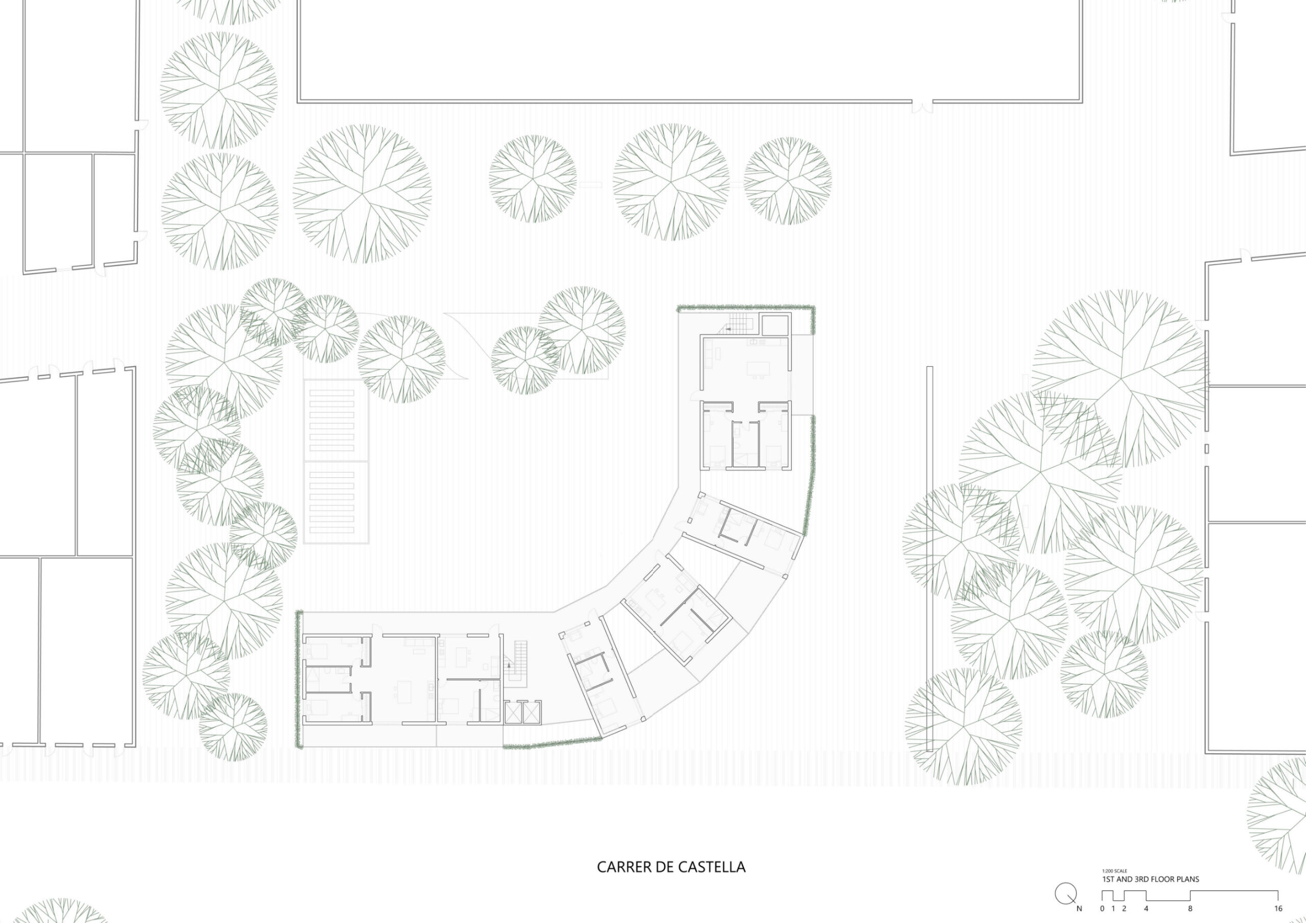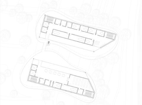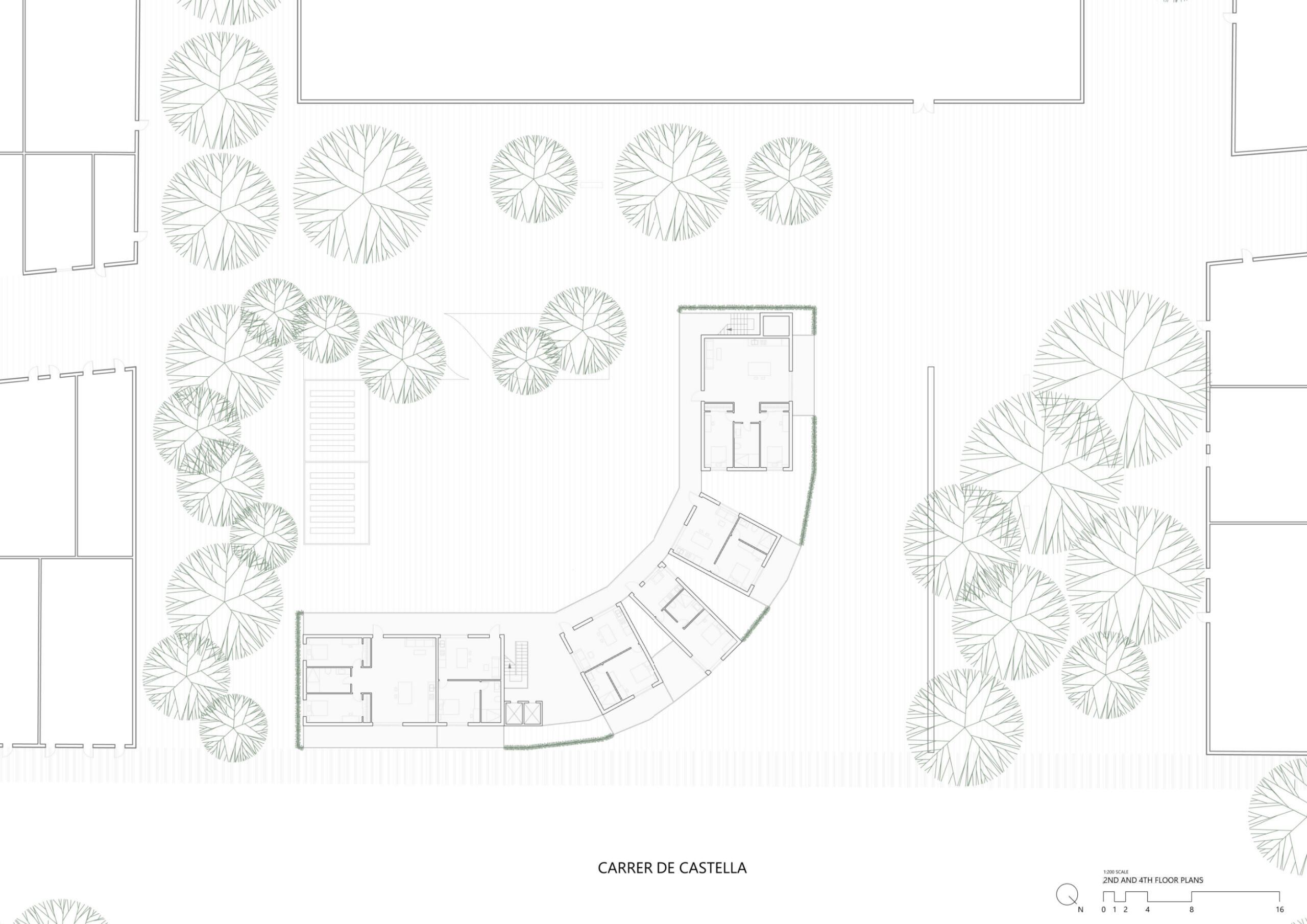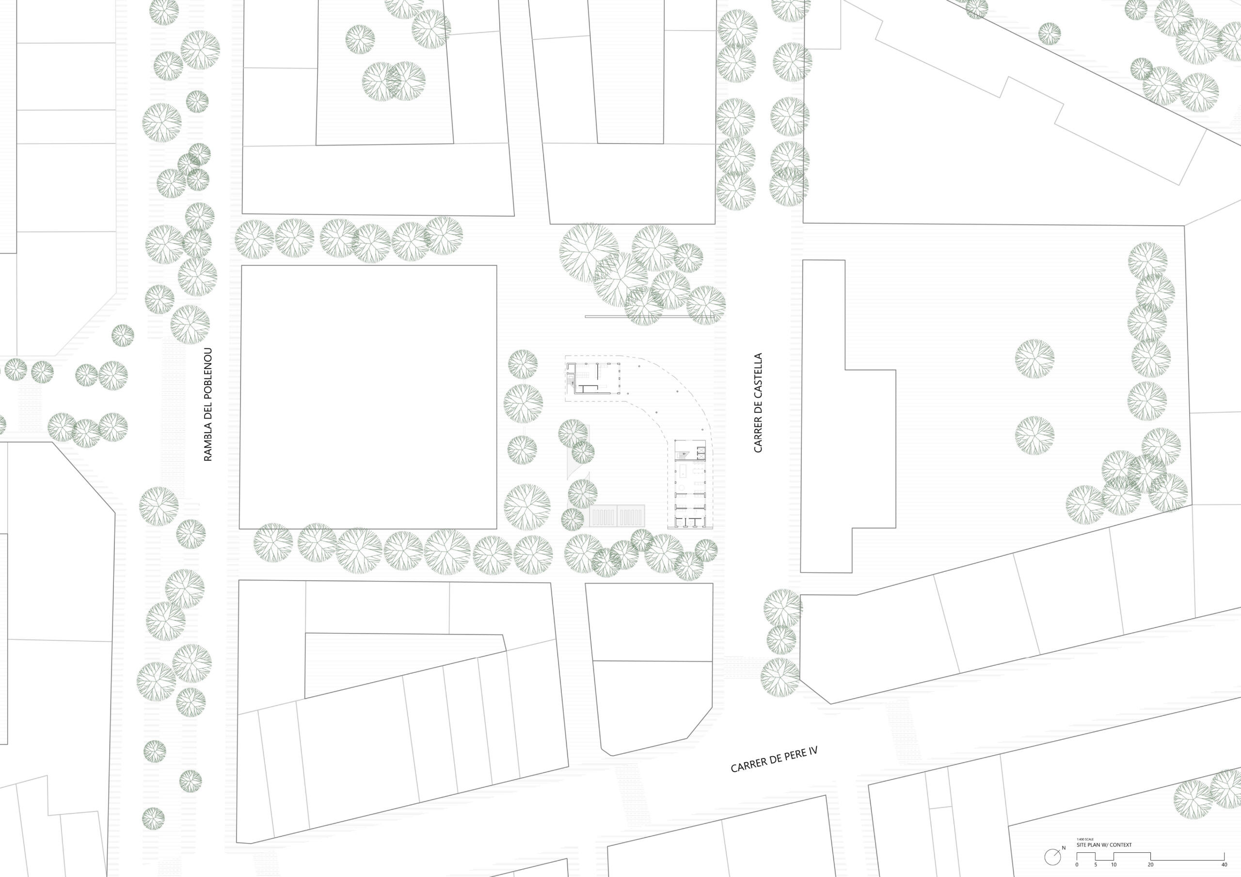 This social housing project, located in the heart of Barcelona's Poblenou district, aims to preserve the circulation and connection between both bordering streets while providing housing and public amenities to the surrounding neighborhood.As Barcelona's city grid is oriented at a 45 degree angle with the top right corner of the site facing north, the building is situated in a curved L shape with its corner to the north; this allows every apartment as well as the adjoining plaza to receive sunlight at all times of the year. The curved corner of the building contains six studio apartments and six 1-bedroom apartments, staggered in a way that allows air and light to permeate the curve from all directions. This eliminates the common "corner problem" that L-shaped buildings tend to have, as well as emphasizing the connection between both sides of the site.The existing wall, formerly from the transformer that used to stand on the site and subsequently preserved as a sign of the power of community organization, was kept to serve as a natural barrier between the quieter plaza and the more robust dining and play area bordering the site on the northwest.