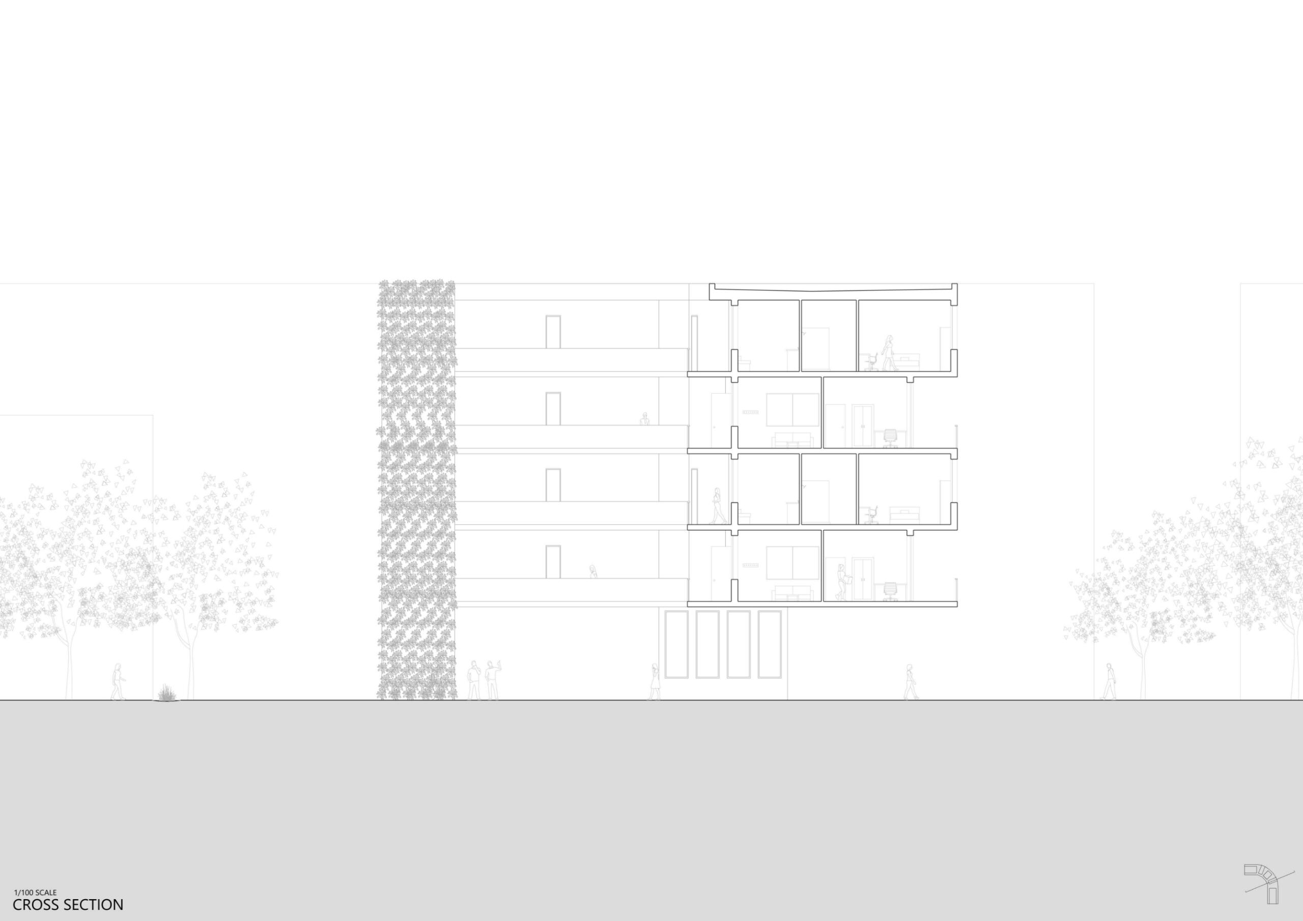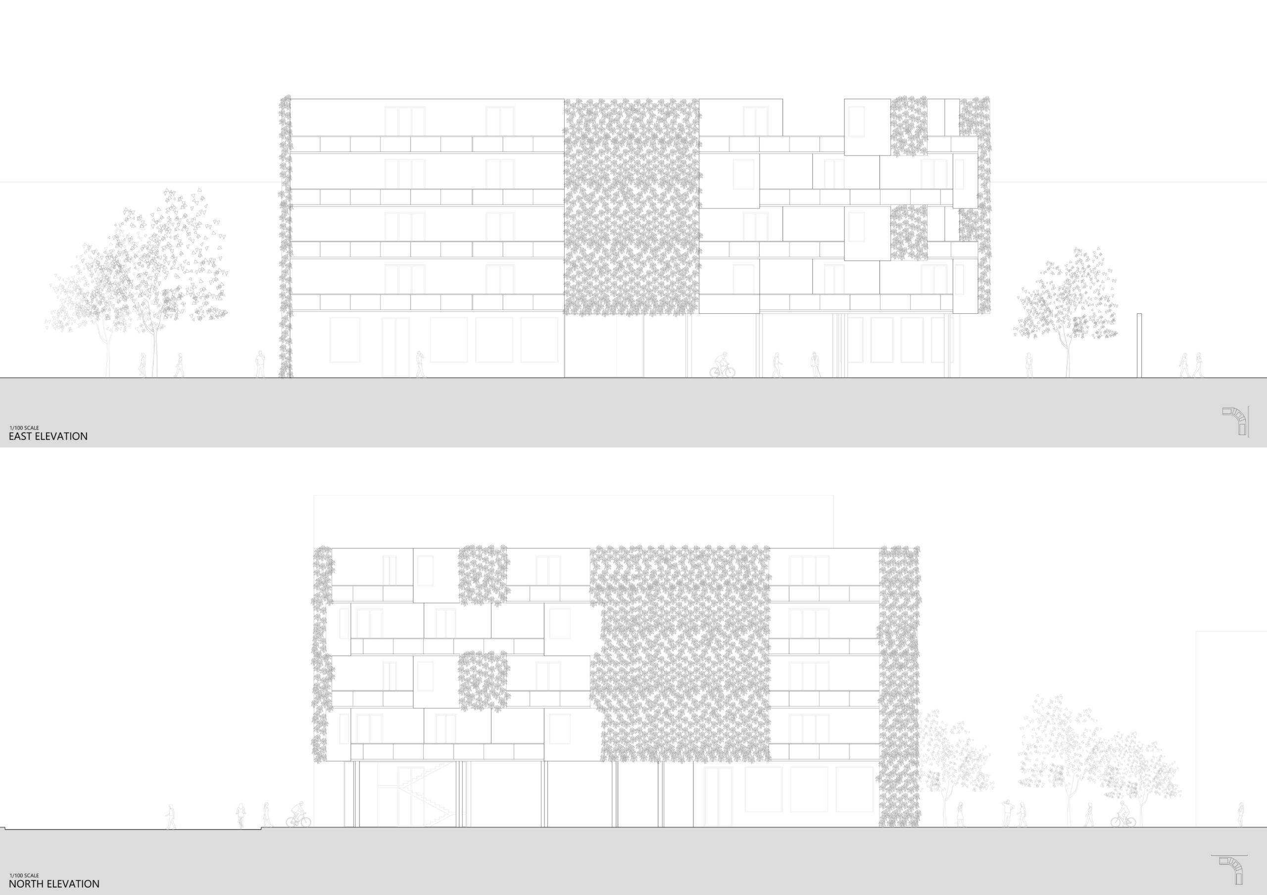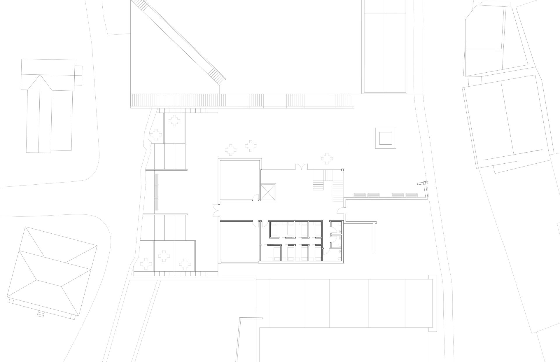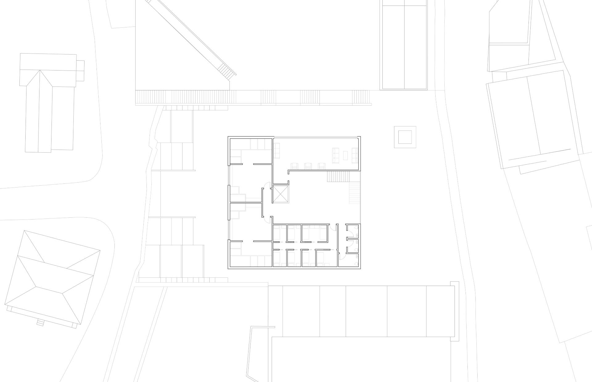 This social housing project, located in the heart of Barcelona's Poblenou district, aims to preserve the circulation and connection between both bordering streets while providing housing and public amenities to the surrounding neighborhood.As Barcelona's city grid is oriented at a 45 degree angle with the top right corner of the site facing north, the building is situated in a curved L shape with its corner to the north; this allows every apartment as well as the adjoining plaza to receive sunlight at all times of the year. The curved corner of the building contains six studio apartments and six 1-bedroom apartments, staggered in a way that allows air and light to permeate the curve from all directions. This eliminates the common "corner problem" that L-shaped buildings tend to have, as well as emphasizing the connection between both sides of the site.The existing wall, formerly from the transformer that used to stand on the site and subsequently preserved as a sign of the power of community organization, was kept to serve as a natural barrier between the quieter plaza and the more robust dining and play area bordering the site on the northwest.