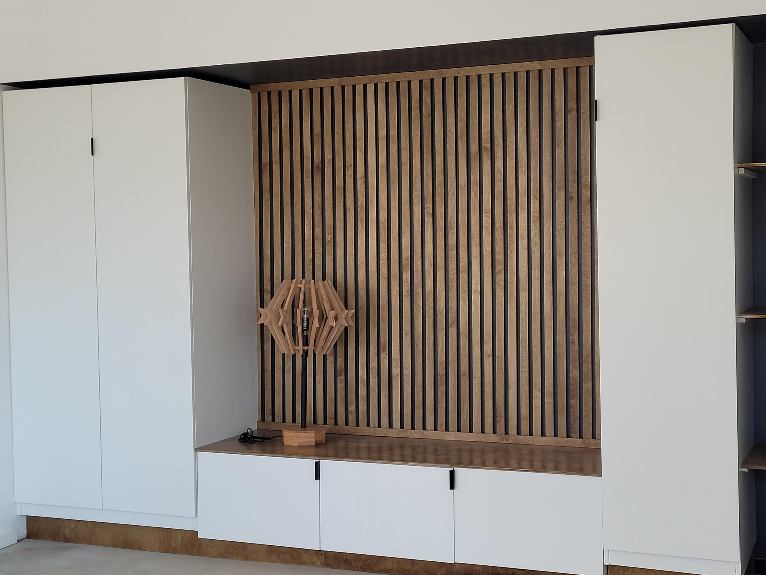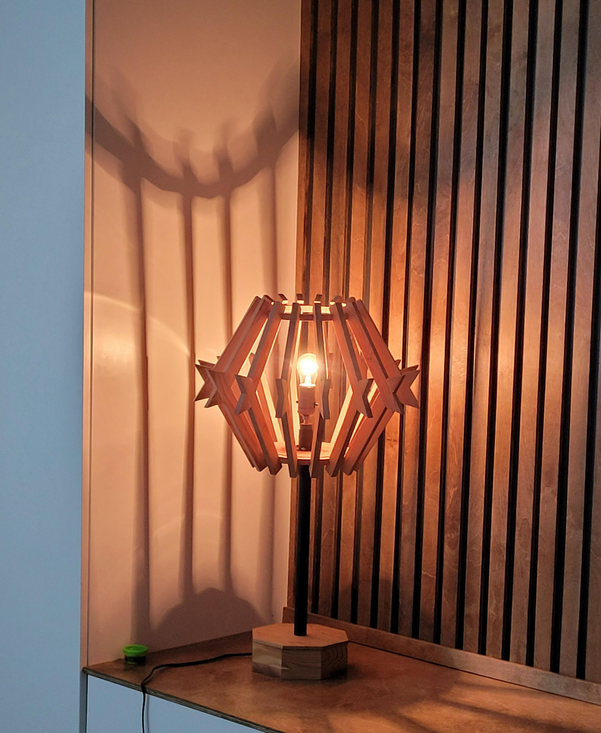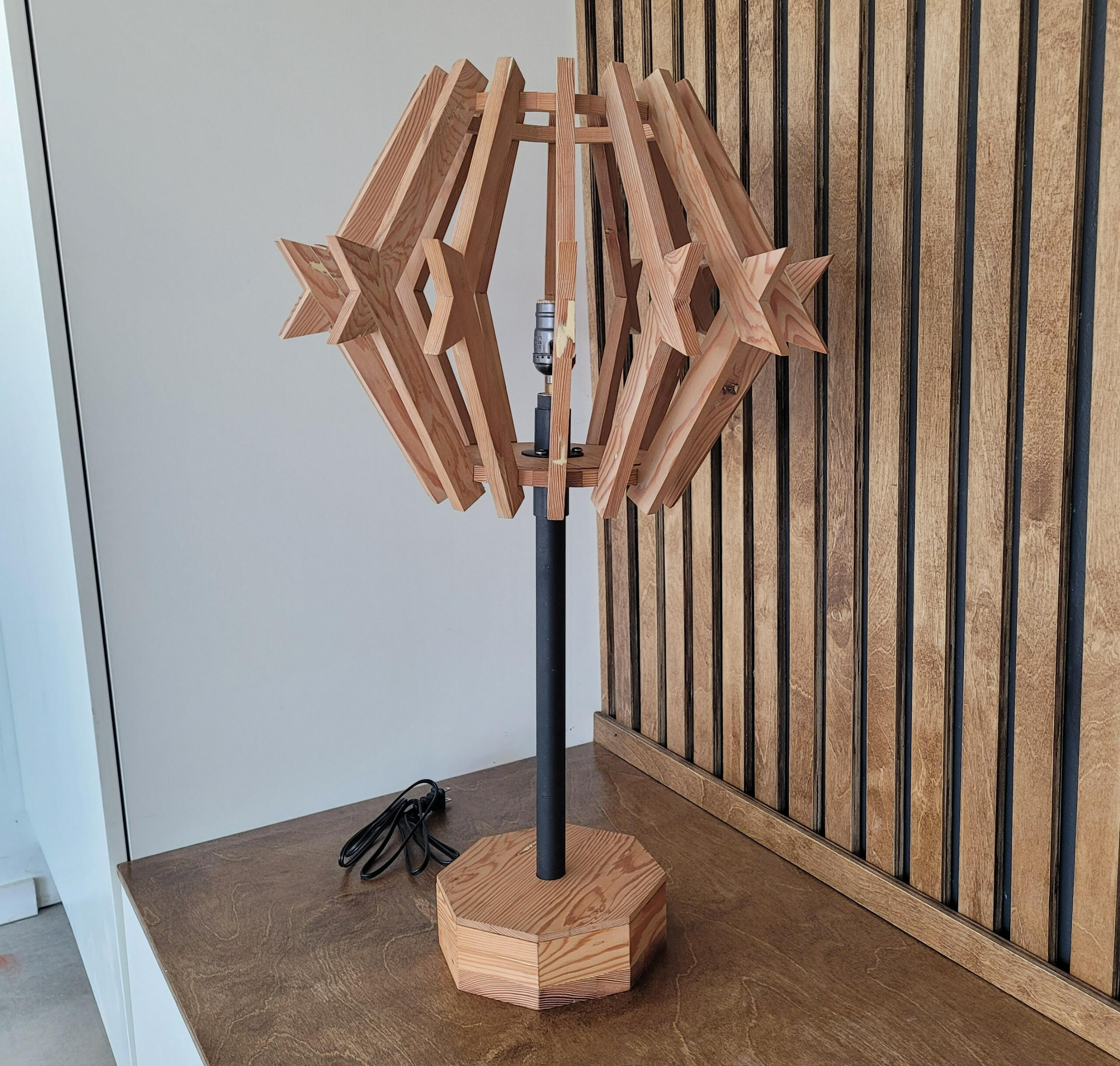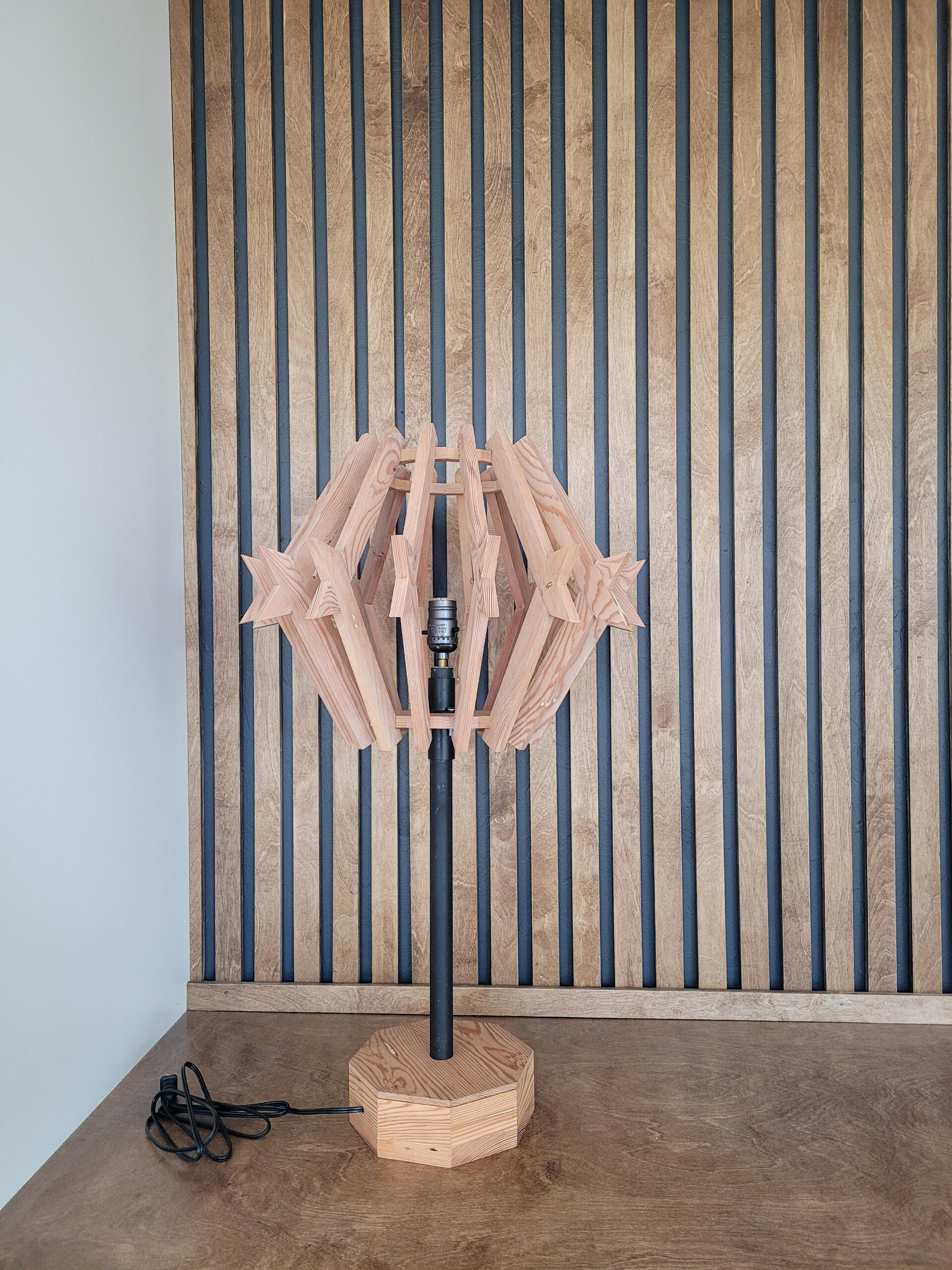 Custom designed and built for a rowhouse situated just off of the University of Arizona's main campus, this lamp primarily utilizes reclaimed douglas fir beams from the university’s Old Main building. Its shape is intended to invoke the overall silhouette of a barrel cactus, a common sight in Tucson’s Sonoran desert.